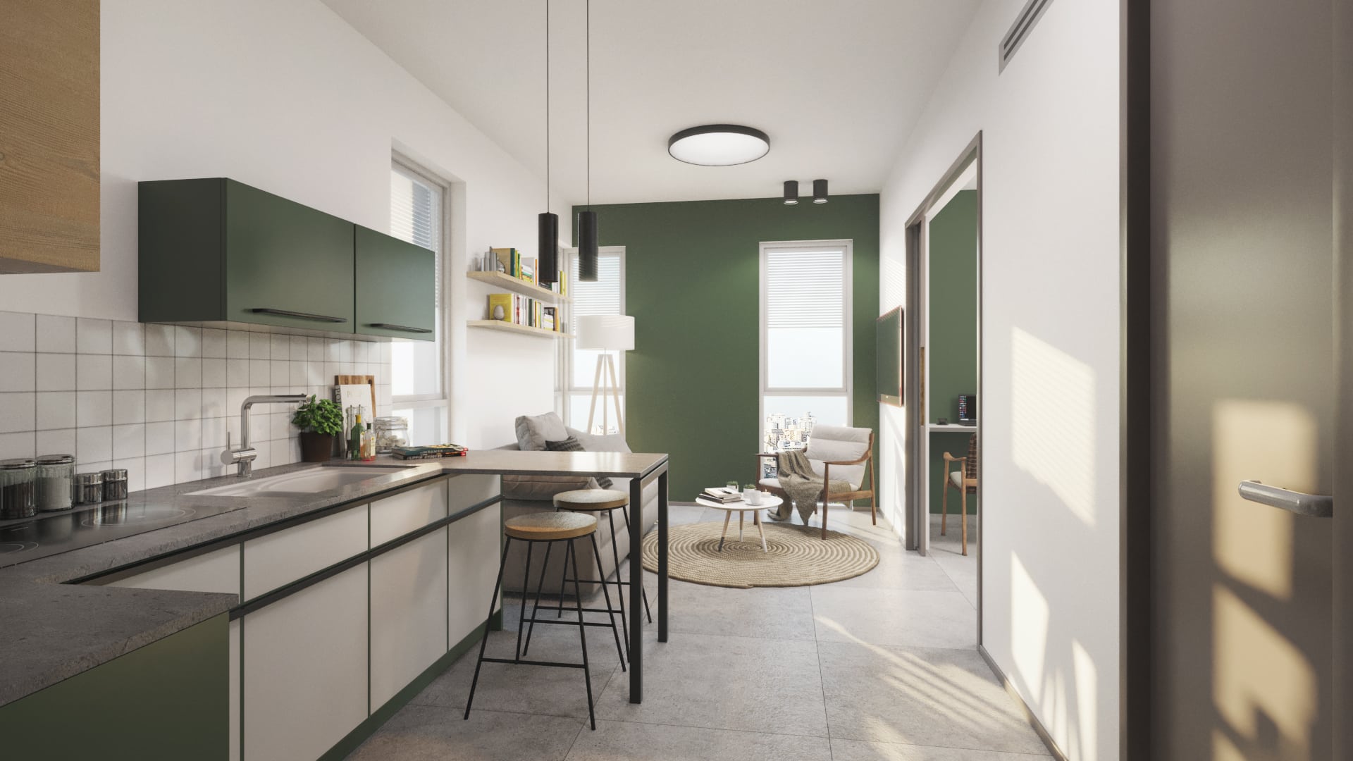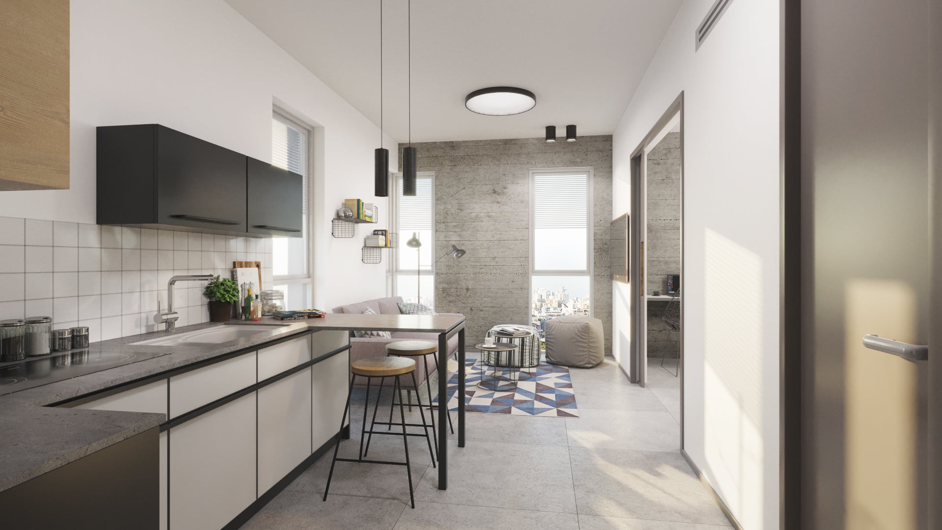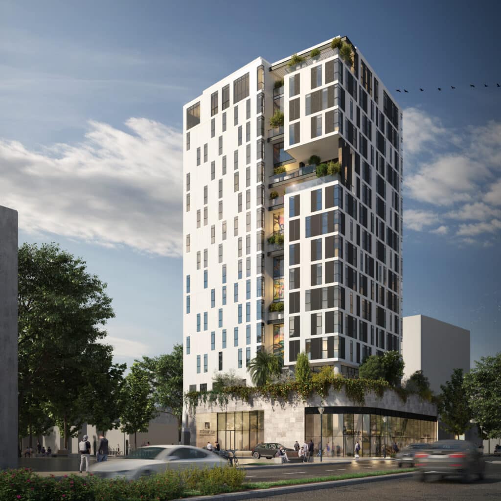 A 16-story building with 2 underground car parks, residential floors, a ground floor, a gallery and public areas. Includes all finishing, infrastructure works, and landscaping in the complex and up to the sidewalk.