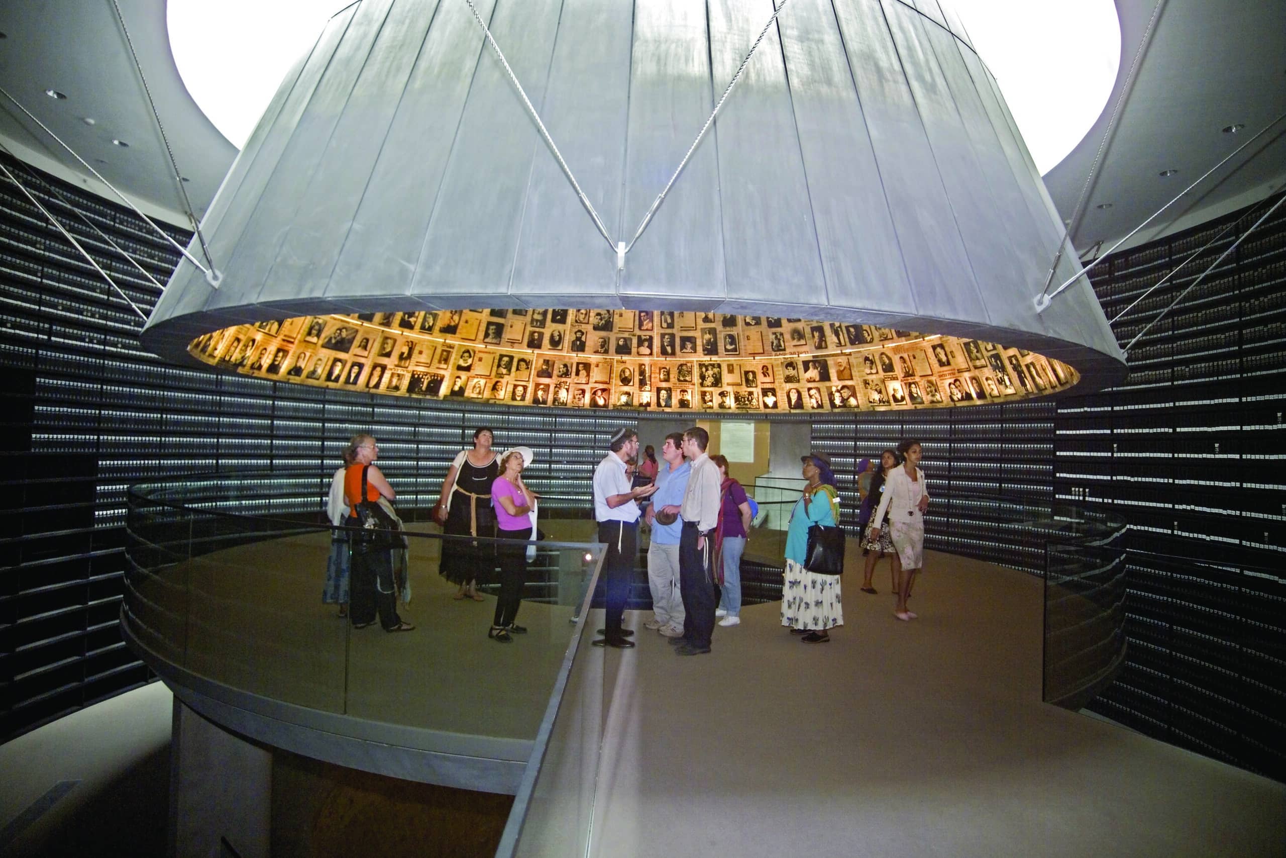 The structures architecture includes unusually high-quality architectural concretes, including sloping concrete walls with varied heights of up to 15 meters, a unique prism shaped structure which penetrates into the mountain, a new round hall of names, excavated into the rock with the bottom filled with water and topped by a 10-meter cone through which daylight emerges.