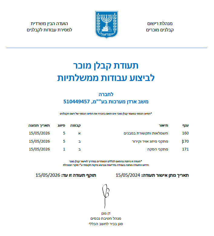 תעודת קבלן מוכר לביצוע עבודות ממשלתיות